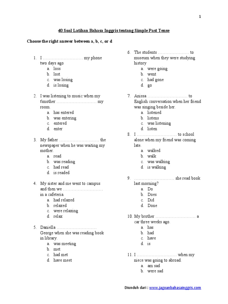 12 contoh soal tenses pilihan ganda pilihlah salah satu jawaban untuk melengkapi kalimat di bawah ini. Tanpa panjang lebar lagi, berikut ini soal bahasa inggris pilihan ganda beserta jawabannya tentang tenses (past tense, present tense, dan future tense). Also explore over 1079 similar quizzes in this category. Soal ini berupa kuis atau tes online bahasa inggris yang mana kalian bisa langsung menjawab soal dengan cara mengklik bulatan di depan jawaban yang kalian anggap paling benar. Siapa bahasa inggris yang membahas tentang tenses? Berikut ini beberapa contoh soal nya berupa pilihan ganda untuk sahabat sbi semua, langsung kita simak ya sahabat sbi 馃檪. Pengertian, rumus, fungsi dan contoh kalimat present continuous tense 'when did the accident happen?' 'when the goods. Salah satunya adalah simple present tense. More images for soal tenses bahasa inggris » Latihan soal tenses bahasa inggris online dan jawabannya. Simple present tense adalah tenses yang digunakan untuk menjelaskan kejadian atau aktivitas yang menjadi kebiasaan atau berlangsung berulang kali. Jan 04, 2019 · 100 latihan soal bahasa inggris tentang simple present tense dan jawabannya;